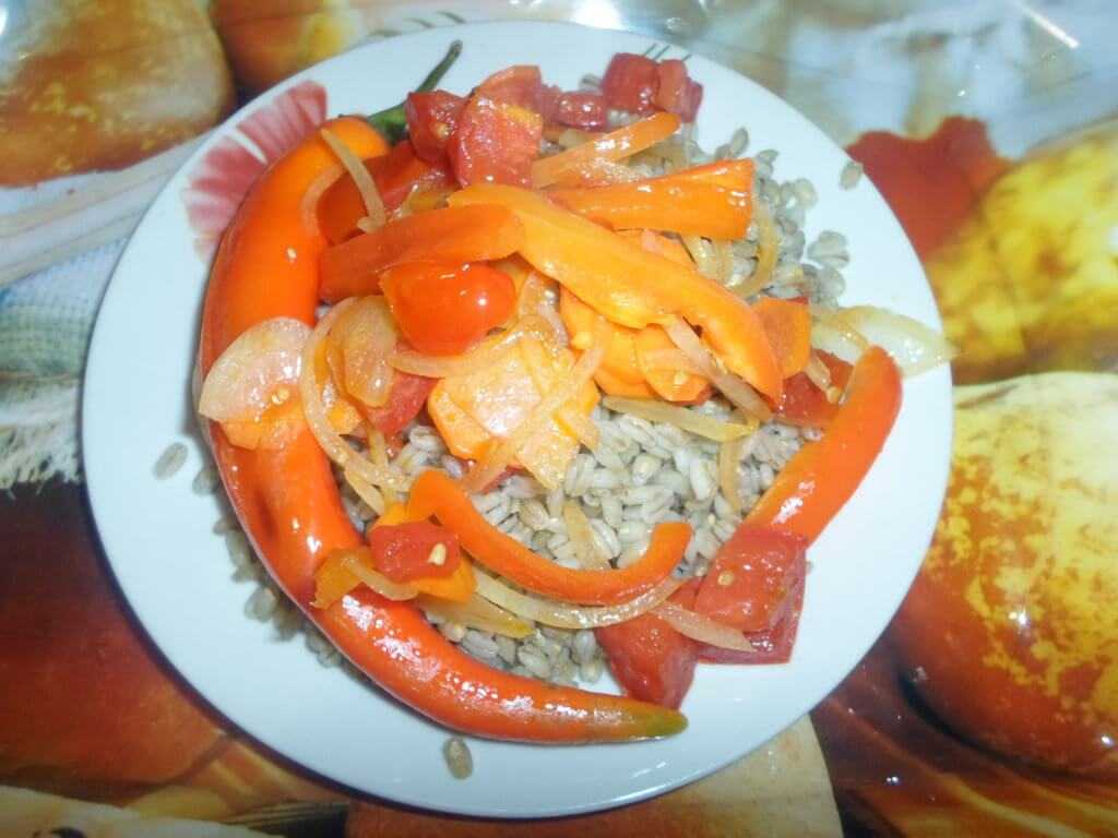 Положите на широкое блюдо готовую перловку, а сверху нее выложите тушеные овощи.