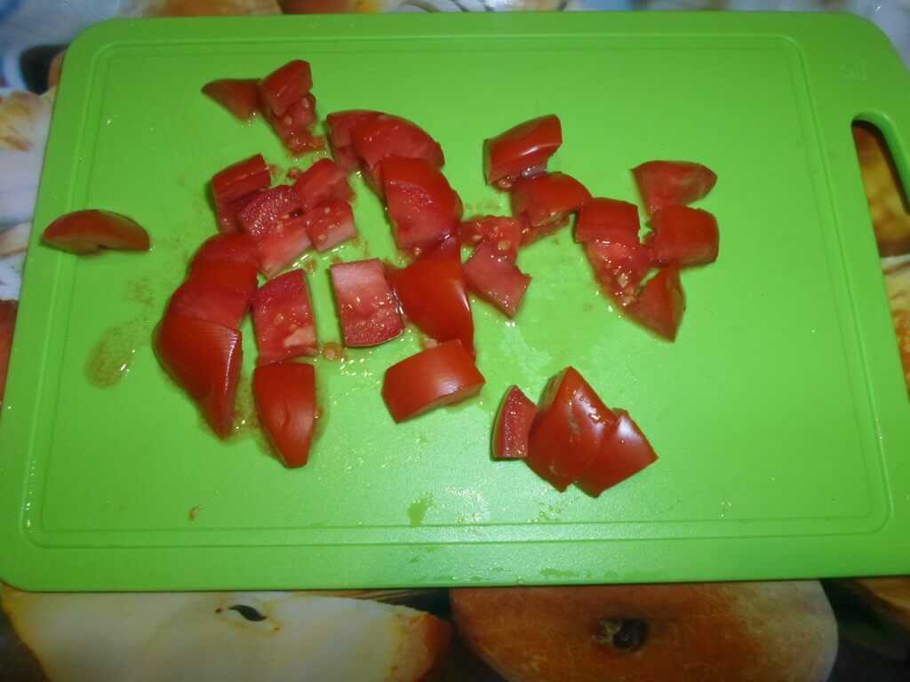 Помидоры с кожурой (можно снять) нарежьте кубиками.