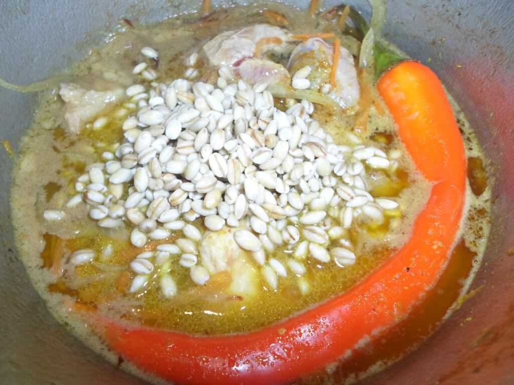 Вливаем кипящую воду так, чтобы вода почти закрыла курицу. Нагреваем до кипения. Готовим 15 минут. Замоченную перловую крупу промываем в дуршлаге. Высыпаем промытую перловку в жаровню.