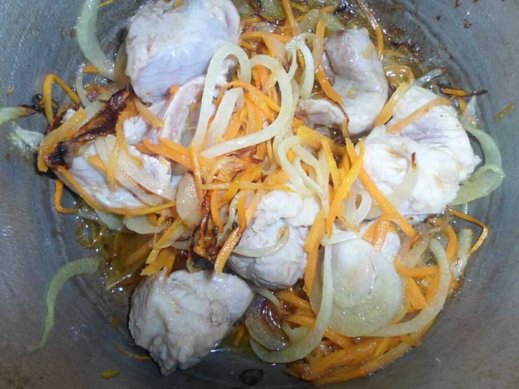 Традиционный плов готовится с жирным мясом: бараниной или свининой. По желанию можно использовать говядину, но в этом случае рекомендуется добавить несколько кусочков курдючного жира или свиного сала, иначе плов будет сухим.
