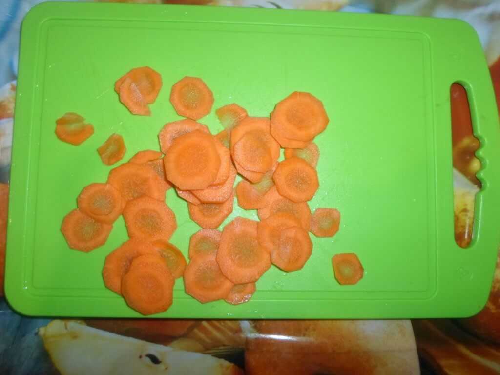 Морковь натирается на тёрке (крупной соломкой), лук нарезать полукольцами. Далее куриное филе нарезать на мелкие куски.