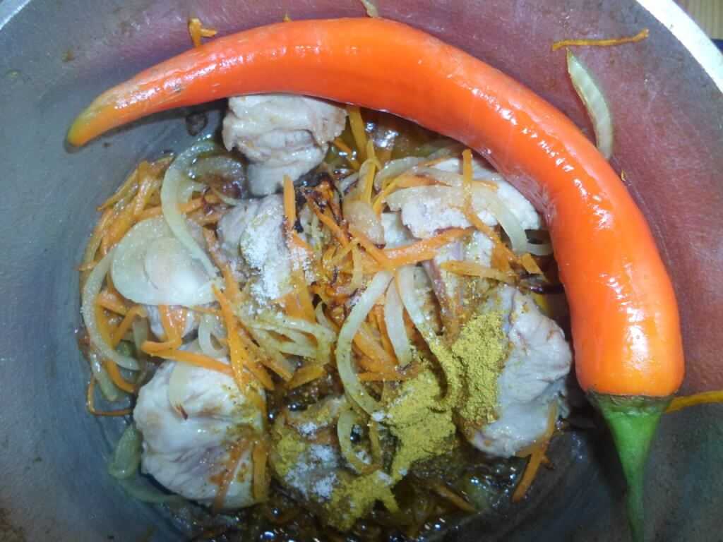 Когда морковь будет готова, кладём в жаровню кусочки курочки. Перекладываем в жаровню обжаренный с чесноком и специями лук.