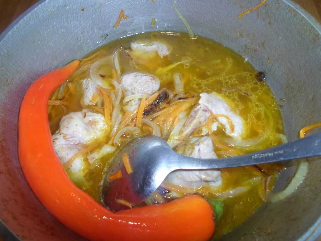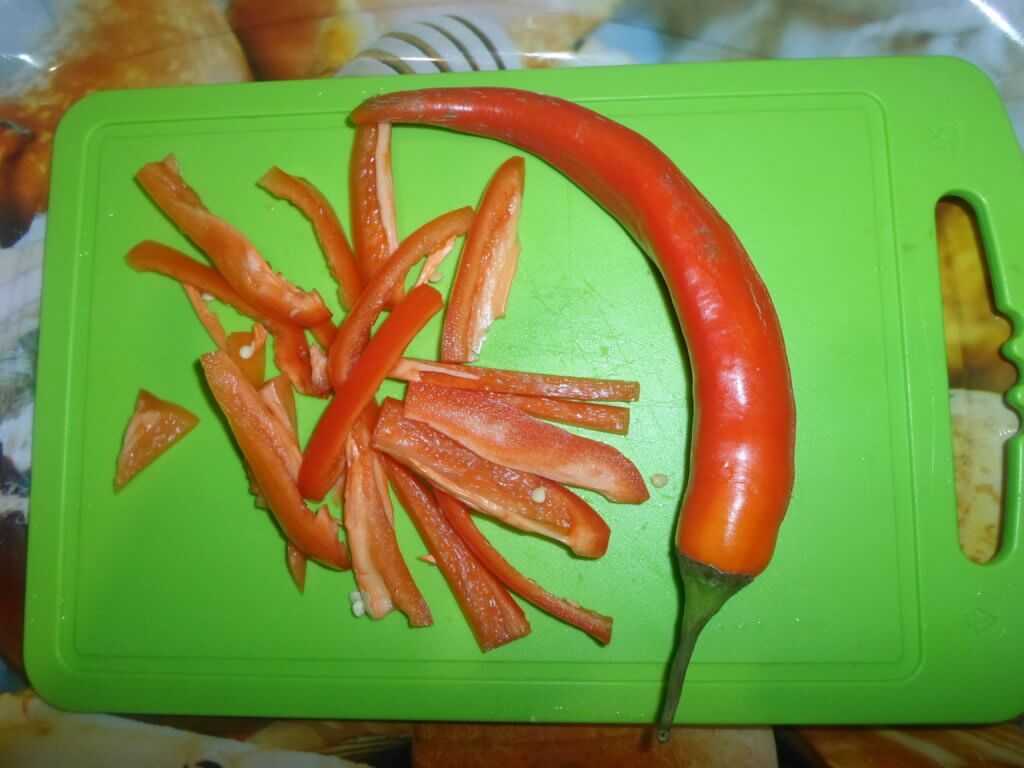 Острый перец нарежьте тонкими брусочками или оставьте целиком, добавить соль и специи.