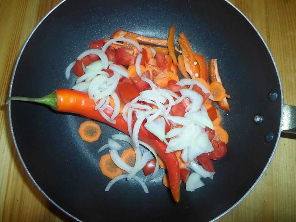 - Овощи обжариваем на масле до полуготовности, добавляем мясо, специи, соль, выдерживаем еще в течение 10 минут.