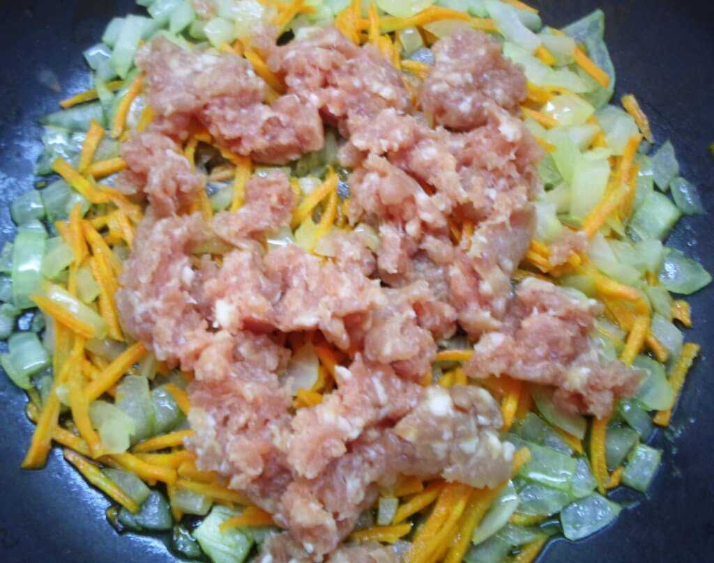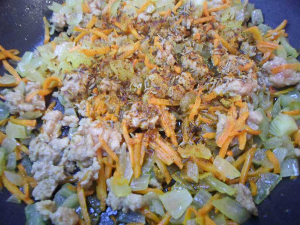 Когда овощи немного размягчатся, добавить мясной фарш, и продолжить обжаривать еще 10 минут.