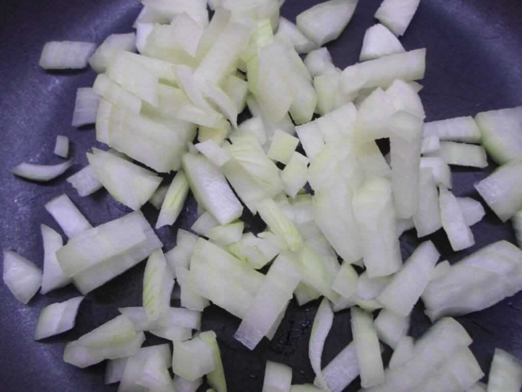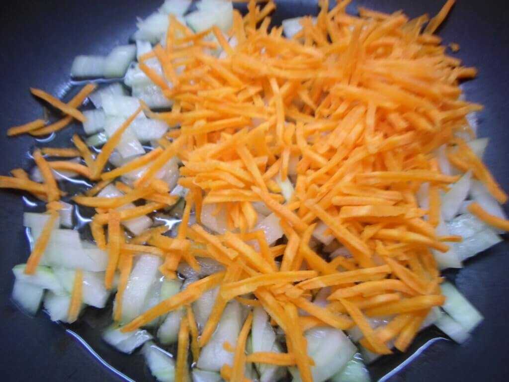 - Сразу готовим овощи: лук нарезаем небольшими кубиками, а морковь нарезаем очень мелкой соломкой (как на фото). Поджарьте овощную смесь на сковороде до приобретения золотистого оттенка.