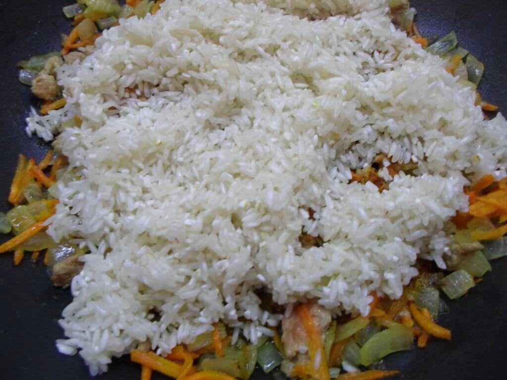 - К обжаренным овощам и курице добавляем несколько раз промытый рис. Сразу кладем соль, специи. Приправы для плова могут быть другими — это дело вкуса.