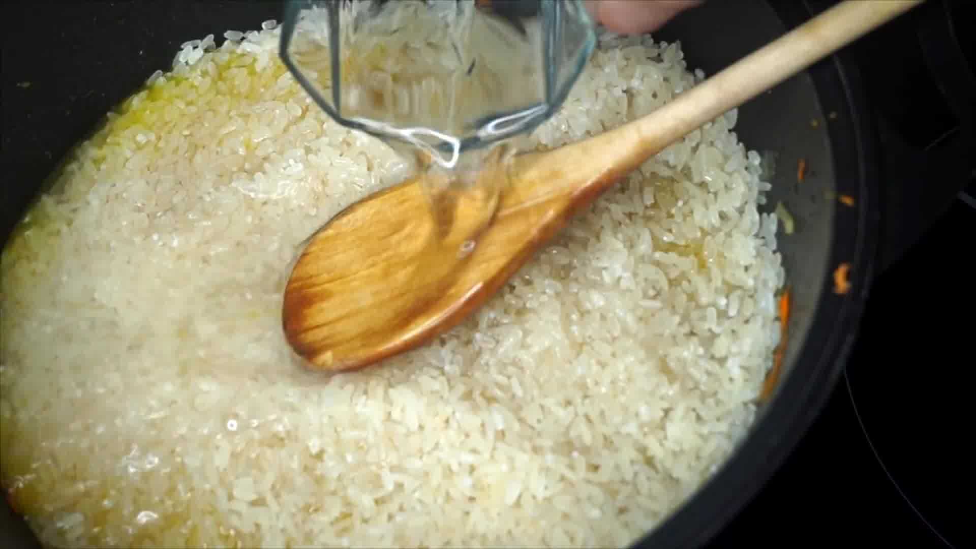 7. Засыпаем сверху рис (не перемешивая!) и заливаем водой так , чтобы рис скрылся под бульоном примерно на 2-3 см. Солим.