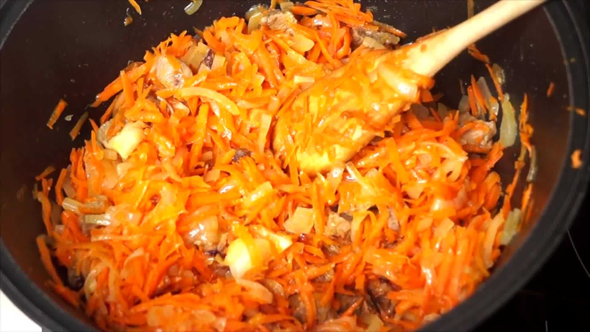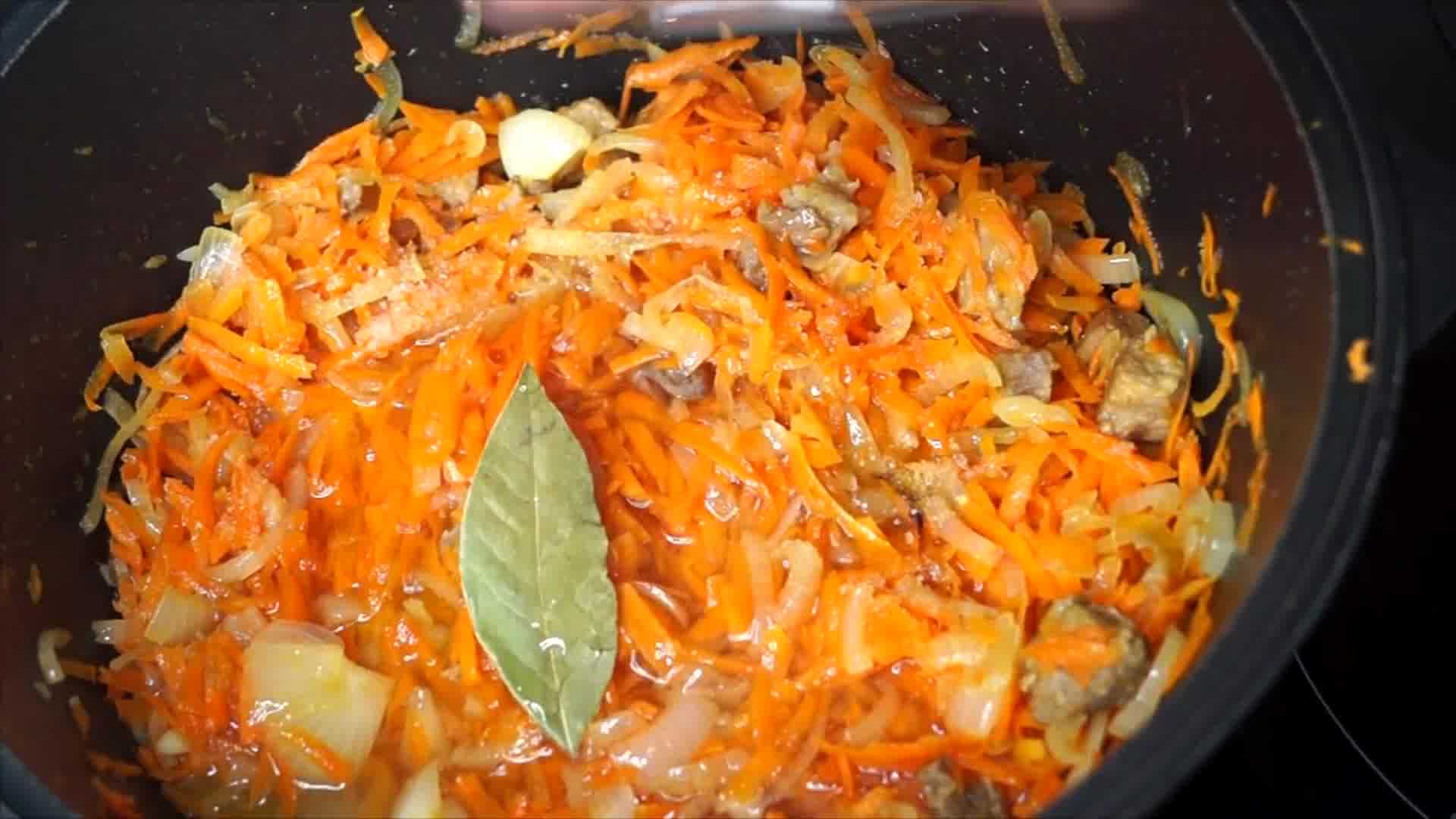 6. Когда воды в казане не останется, или останется совсем на дне, всыпать морковь.