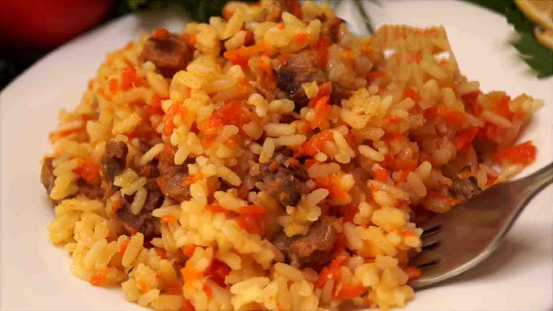 4. Блюдо ставится в центр стола. Выглядит оно аппетитно. В Узбекистане рис едят руками прямо из блюда. У нас каждому подается тарелка и вилка.