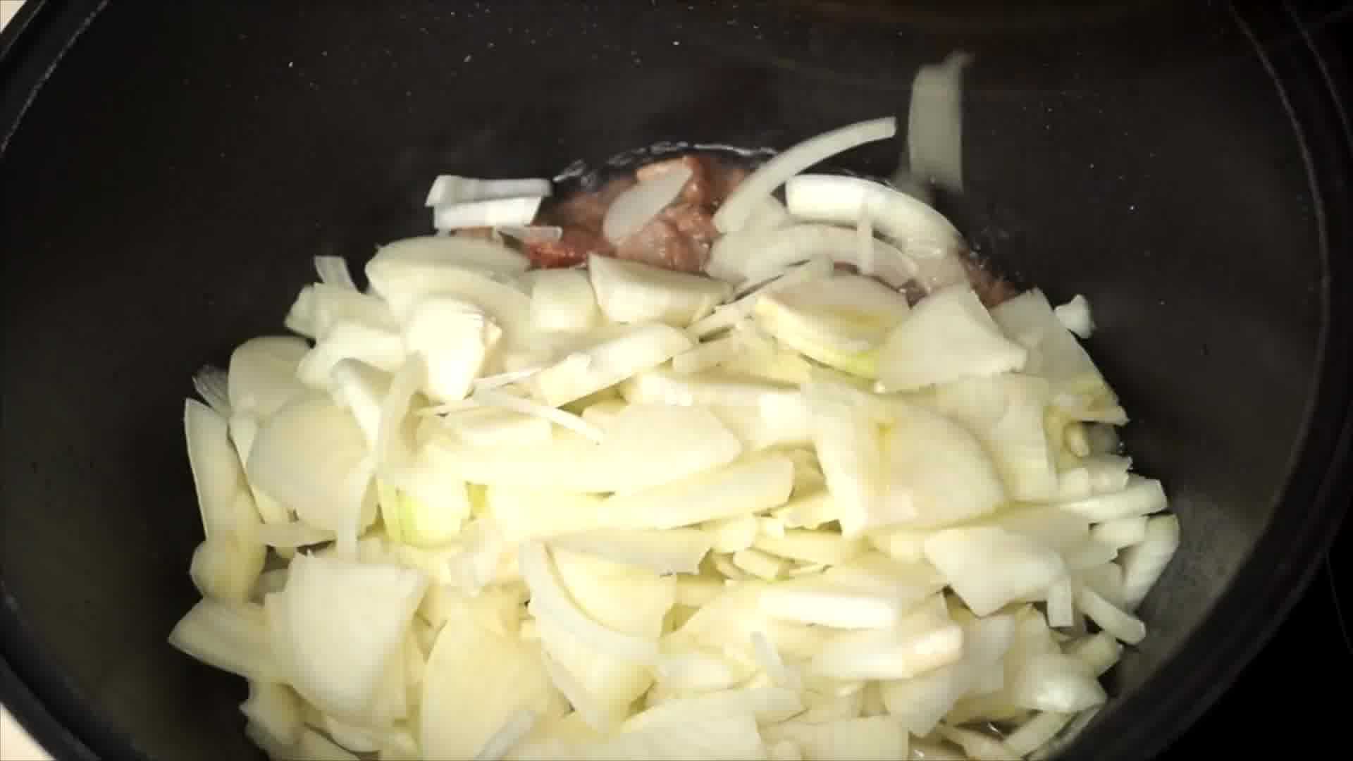- Лук порезать полукольцами, морковь – брусочками, закинуть к мясу, припорошить солью и специями, вымешать, томить на среднем огне четверть часа, плотно накрыв крышкой.