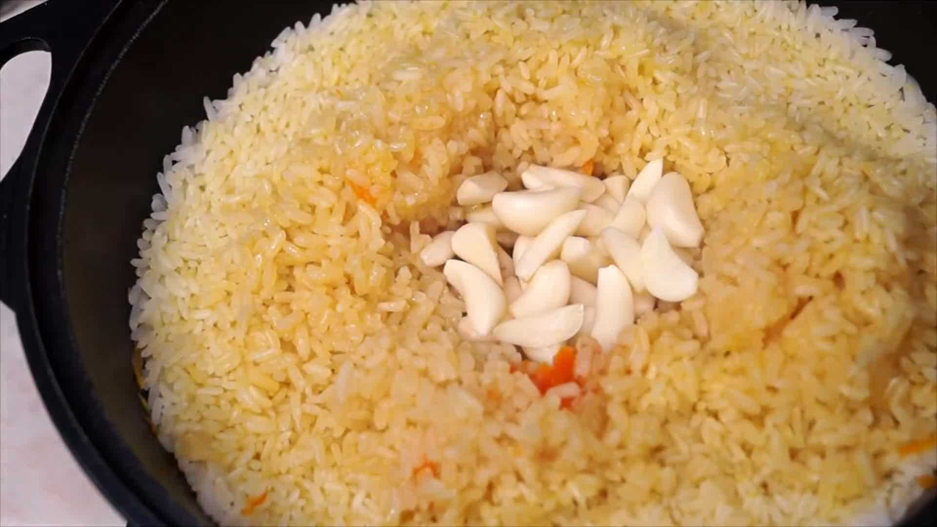 За 10 минут до готовности , кладем чеснок. Зубчики чеснока нужно предварительно разрезать вдоль на 4 части и воткнуть каждую дольку в рис по всей поверхности плова.
