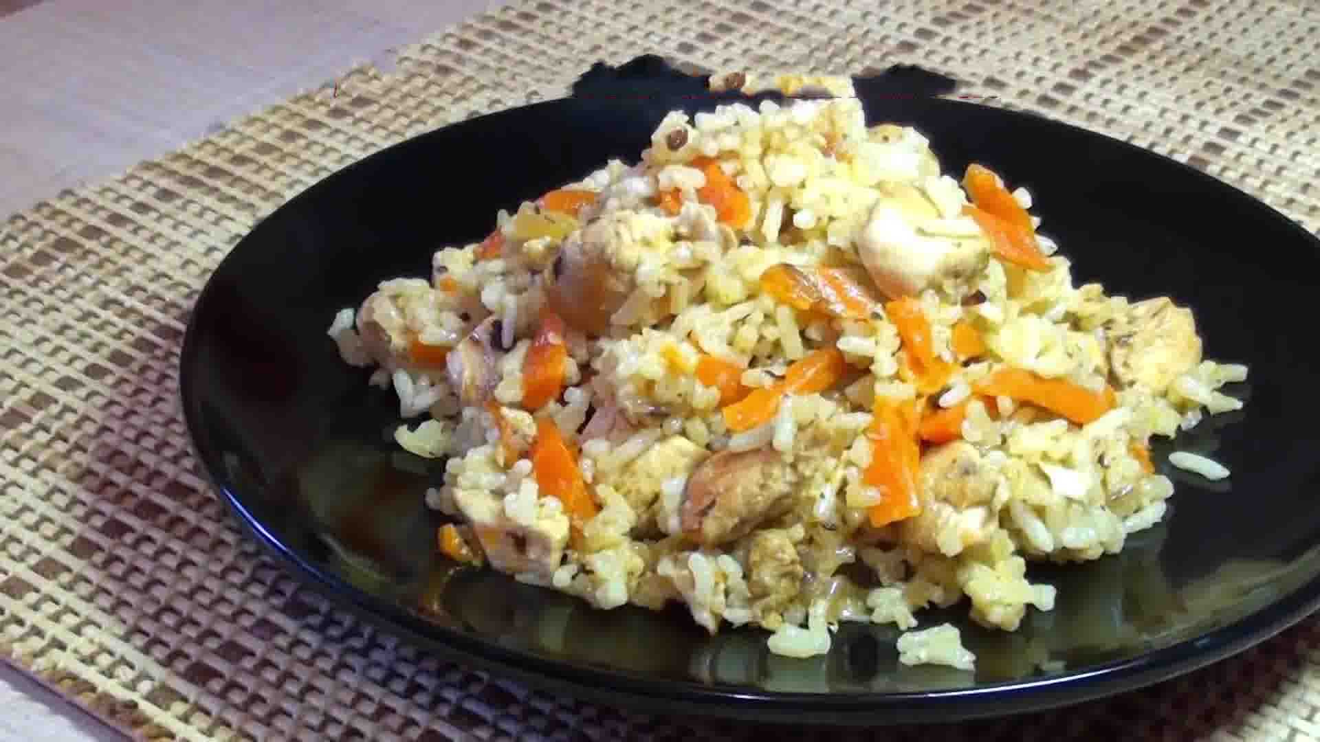 Этот видеоролик демонстрирует пошаговый рецепт рассыпчатого плова с курицей на сковороде.