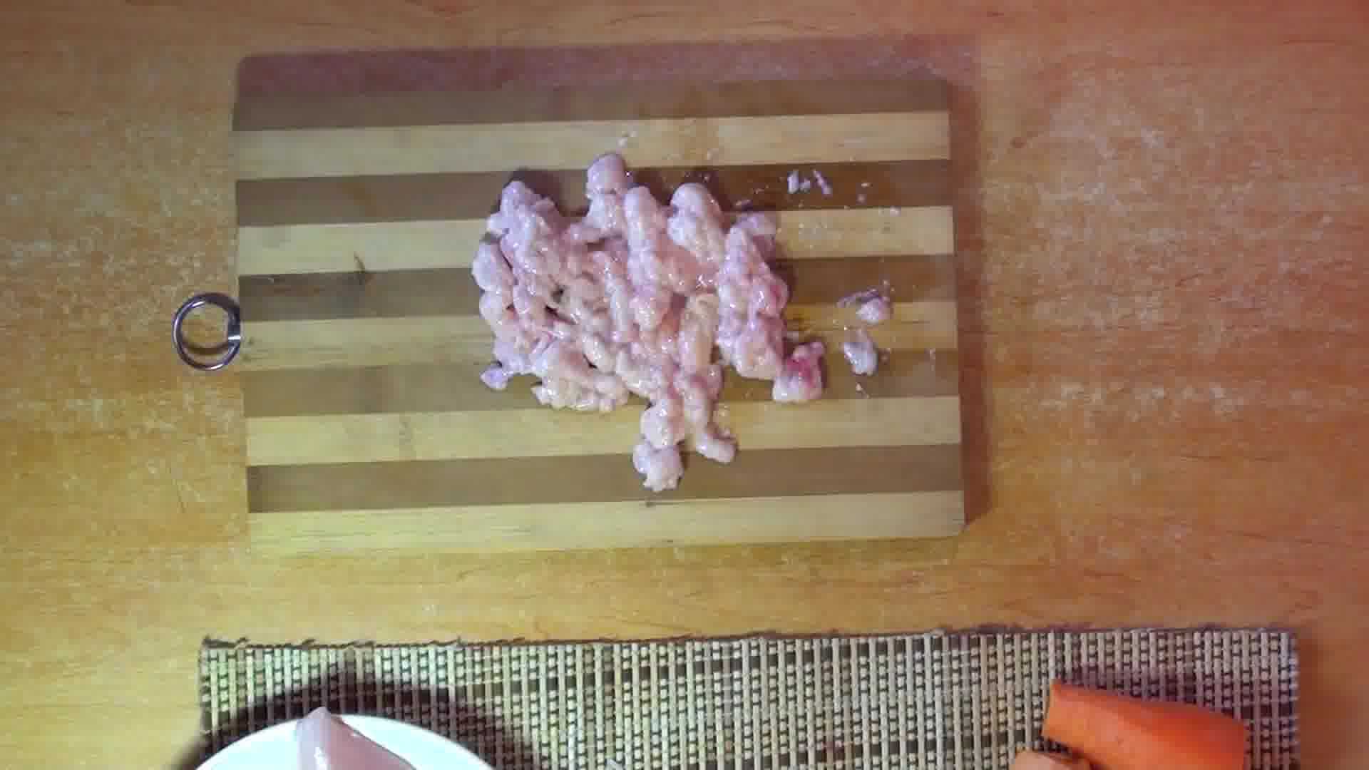 1. С тушки я всегда снимаю кожу. Затем обмываю мясо и обсушиваю бумажным полотенцем. Порезать его на крупные части. Лучок помельче, а морковь длинненькой соломкой. Крупу промыть на несколько раз, пока вода не будет прозрачной.