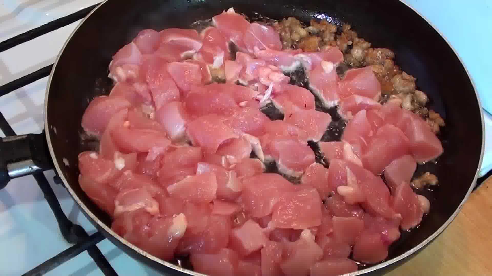 - Филе курицы (1-2 шт.) порежьте небольшими кусочками. Раскалите в сковороде 30 мл масла и обжарьте в нем курицу до золотистого цвета.