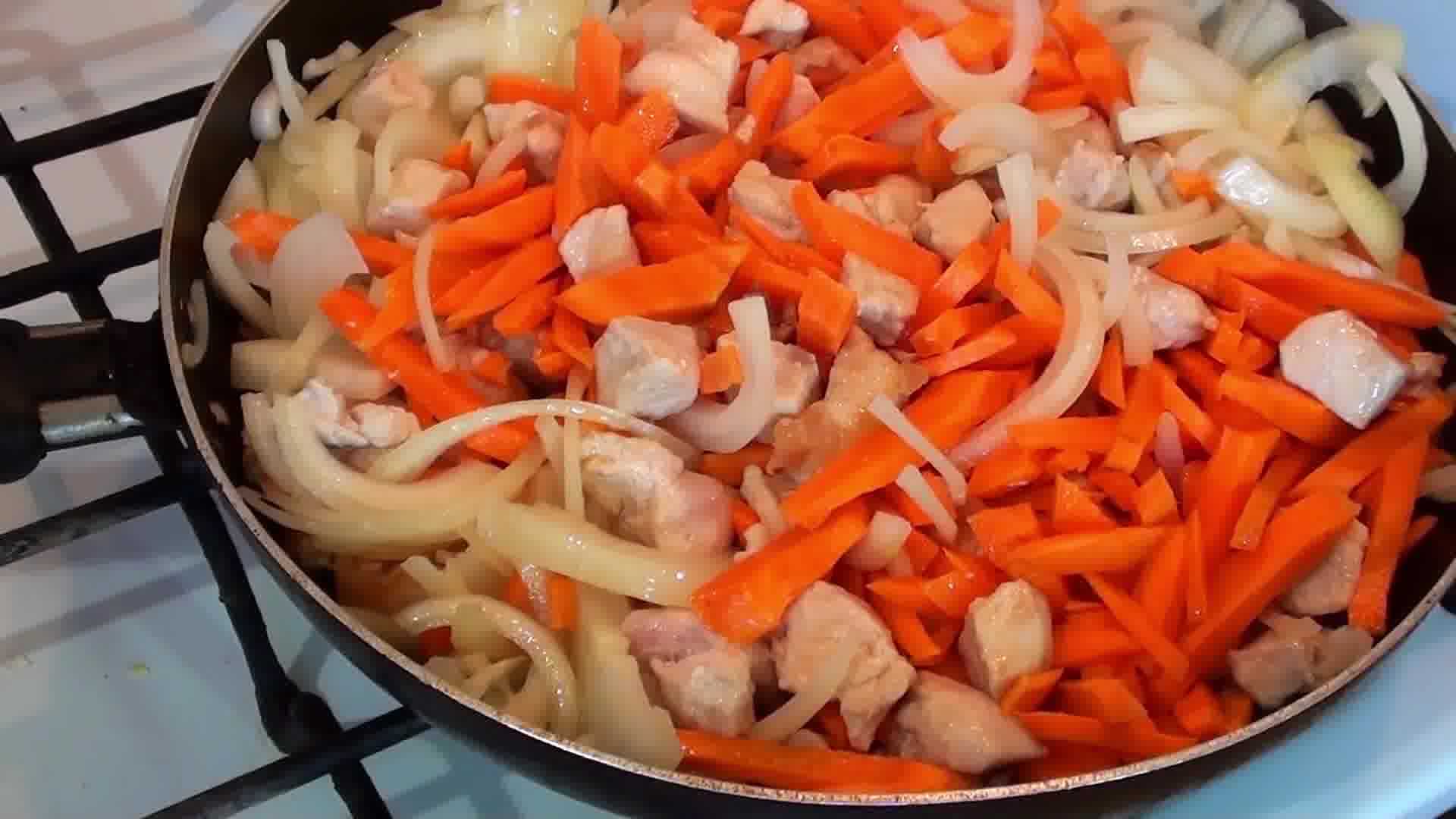 - Луковицу и морковь нашинковать квадратиками. Закинуть к курице. Тушить 7-10 минут.
