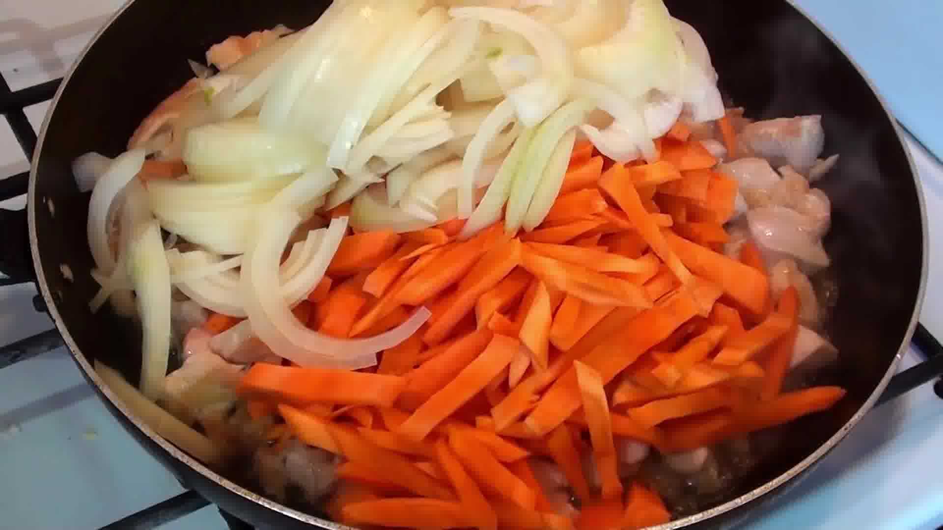 Традиционная рецептура подразумевает равное количество риса, мяса и моркови. А вот лука – чуть меньше, 500-700 грамм на каждый килограмм курицы.