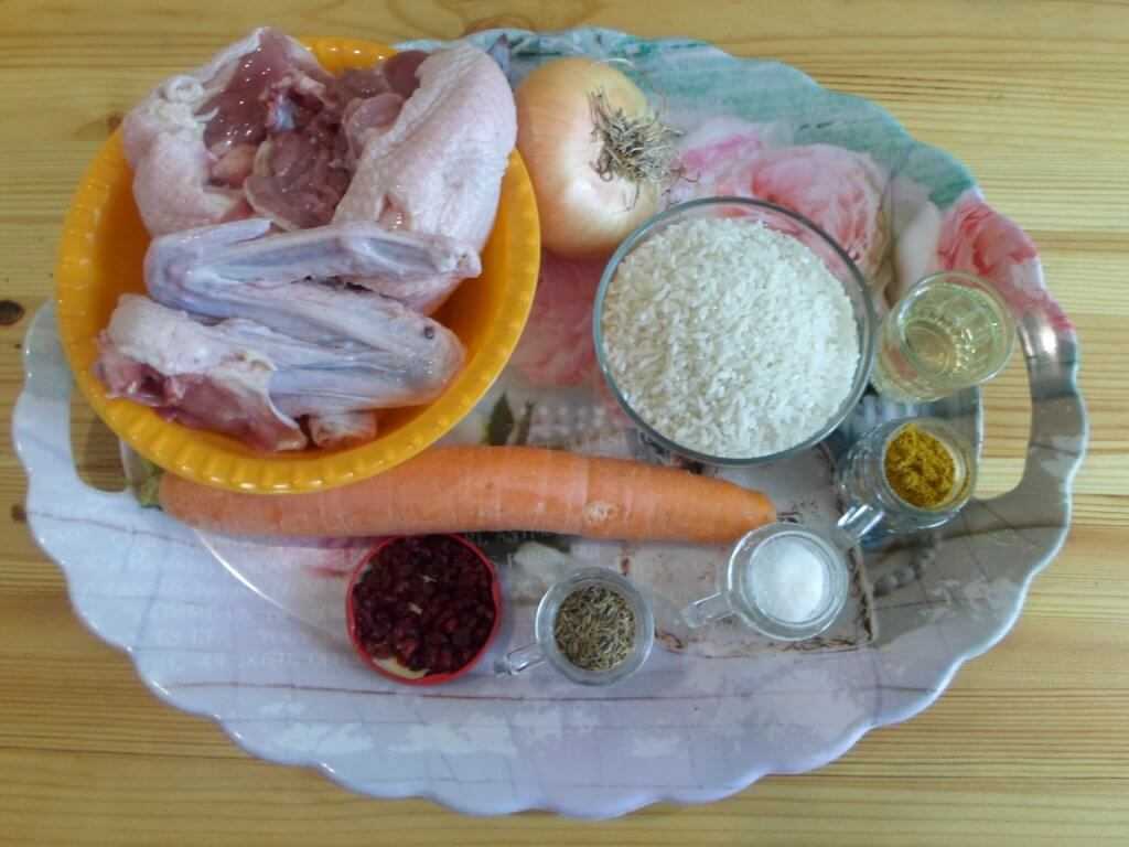 Тебе понадобится: 500 г филе индейки, 2 стакана риса, 1 морковь, 1 лук, 1 головка чеснока, 2 ст.л. растительного масла, 1 ст.л. барбариса, 2 лавровых листа, по 3 горошины черного и душистого перцев, соль, 800 мл бульона.