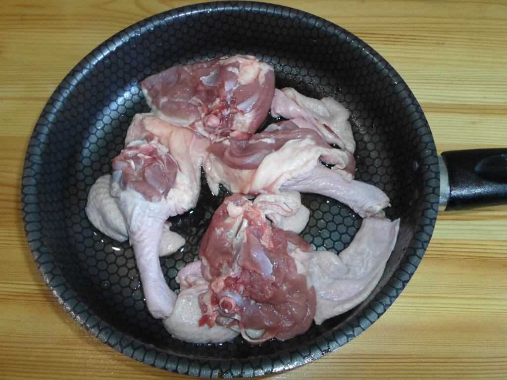 - Добавьте кусочки утки, подлейте растительное масло и с поднятой крышкой жарьте до корочки со всех сторон.