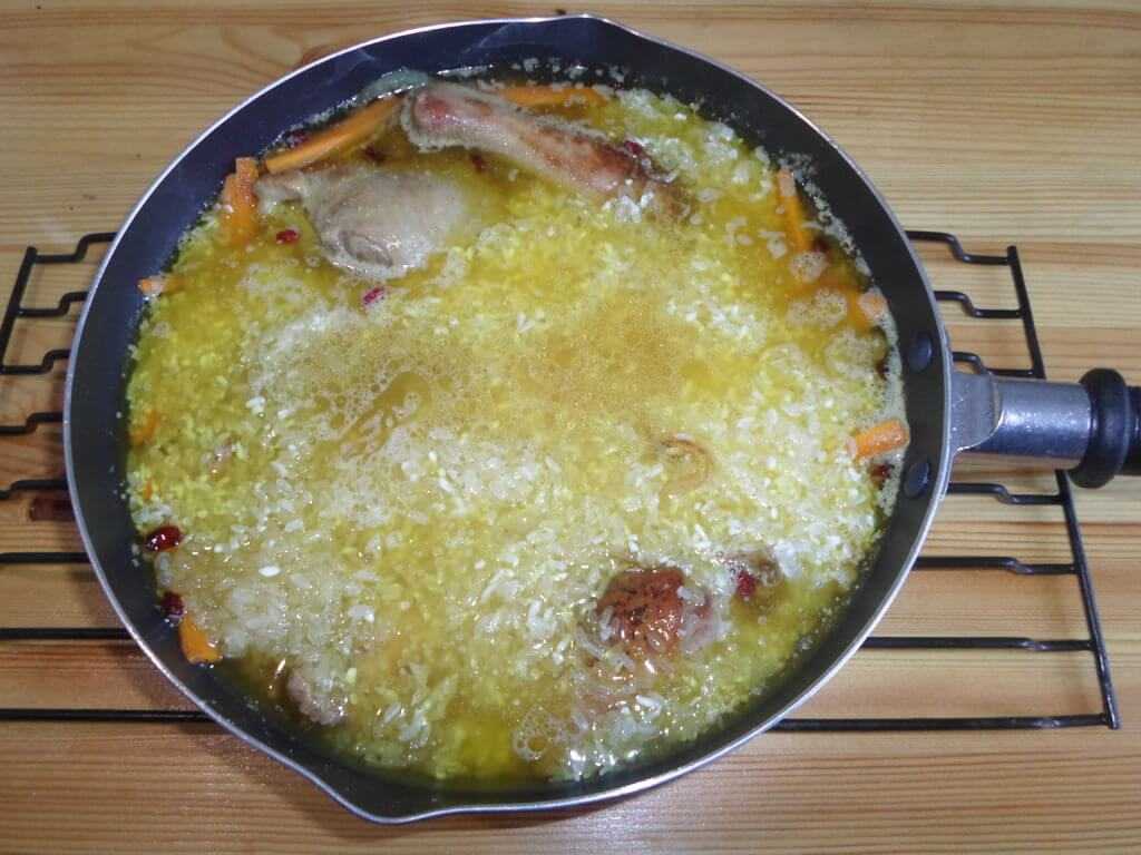 - Уберите головку чеснока, перемешайте все и всыпьте рис. Также добавьте соль и шафран, хорошо перемешайте.