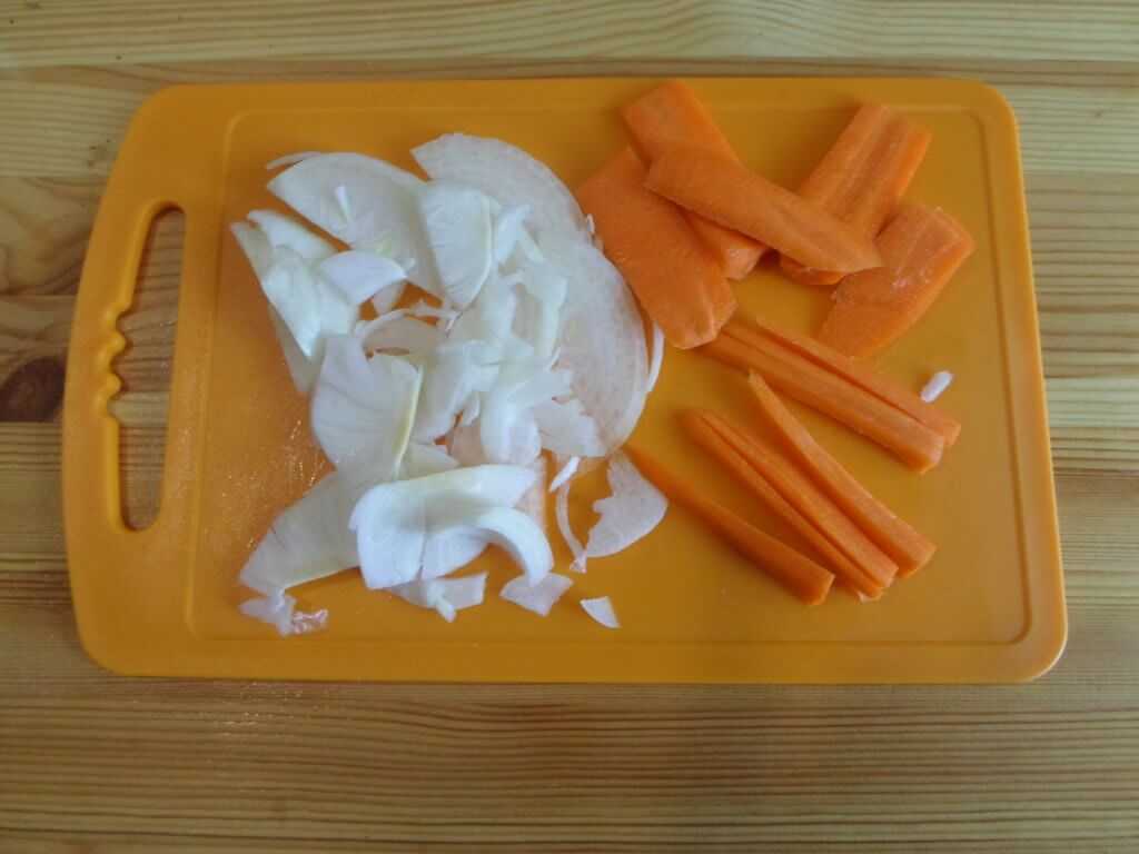 - Морковь очистите, нашинкуйте короткой соломкой. Лук измельчите тонкими полукольцами.