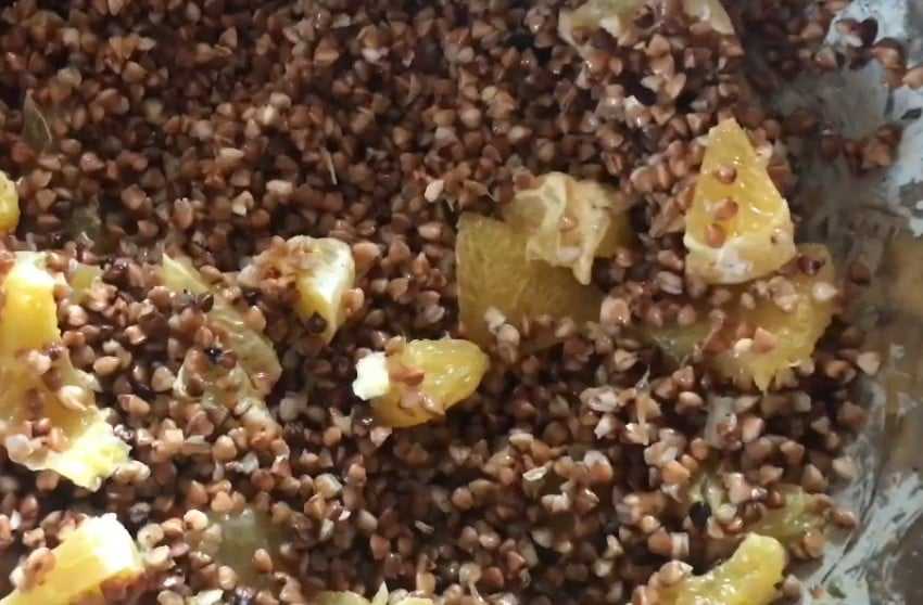 5. Очистите и нарежьте мелкими кусочками апельсин. Перемешайте его с гречкой и засыпьте в мультиварку, добавьте небольшое количество воды.