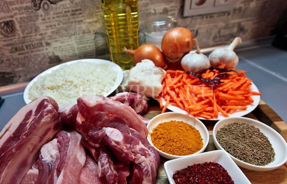 Я люблю плов и готовлю его очень часто. Если у меня есть время, я готовлю его на плите, а если нет, то в духовке. На этот раз я решил приготовить плов со свининой, точнее, со свиной грудинкой. Я добавил его в плов, потому что нашел просто замечательную свиную грудинку с небольшим количеством жира. Вот что я использовал для приготовления тушеного плова. Я считаю, что если вы не можете приготовить плов на кухне, то сделайте его в духовке. Когда рис варится с закрытой крышкой, он становится рассыпчатым и очень вкусным. Наличие жирного мяса в плове делает его сочным. А добавление различных специй придает вкус запеченному плову. Я готовила плов для большой вечеринки, поэтому использовала целую большую кастрюлю. Если этого количества для вас слишком много, уменьшите его и готовьте столько, сколько вам нужно.