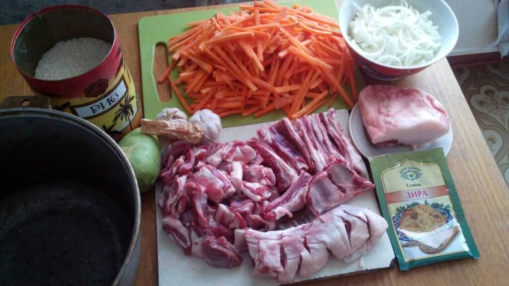 Сначала рис промывают, замачивают в теплой воде, немного насыпав соли. Тем временем ополаскивают и вытирают салфетками баранину, морковь, лук. Приступают к нарезке: