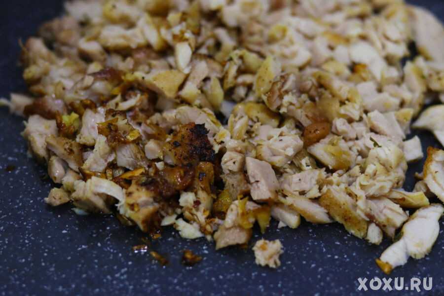 Мясо курицы нарежьте небольшими плоскими кусочками, чтобы прожарка производилась быстрее. Обжарьте их на масляной сковороде до готовности или на электрогриле, не используя при этом масла. Во время этого процесса мясо сдобрите солью и перцем. Румяные кусочки отставьте в сторону, чтобы они немного остыли.