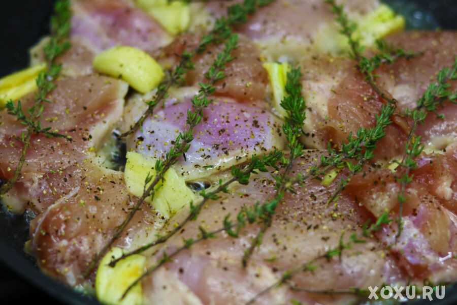 3. Когда филе достаточно помаринуется, переложите его на хорошо разогретую сковороду с растительным маслом. Посолите сверху по вкусу и обжаривайте одну сторону 2 минуты. Затем переверните, полейте остатками маринада и жарьте еще 2 минуты. После этого переместите курицу в разогретую до 20 градусов духовку.
