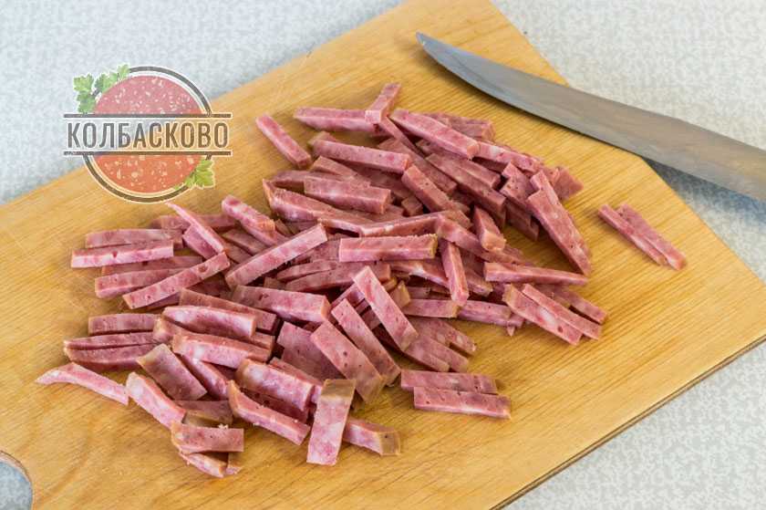 - Подготовить сосиски. Очистить от шкурки. Порезать кружками, не дорезая их до конца.