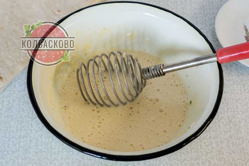 Приготовим для закуски кляр. В глубокую посуду разбиваем яйца, добавляем соль, перец и 1/3 стакана муки. Хорошо перемешиваем венчиком до получения однородной массы.