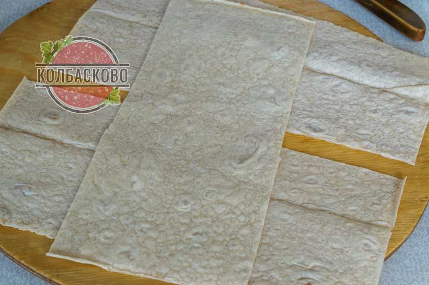 Листы армянского лаваша нарежьте на прямоугольники. В ширину лист лаваша должен получиться больше сосиски примерно на 2-3 см с каждой стороны.