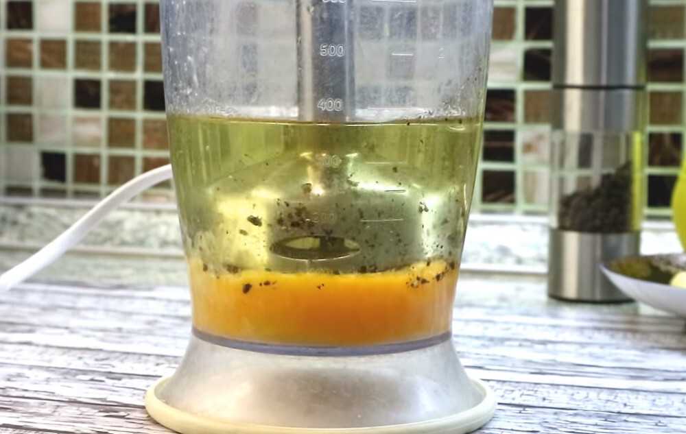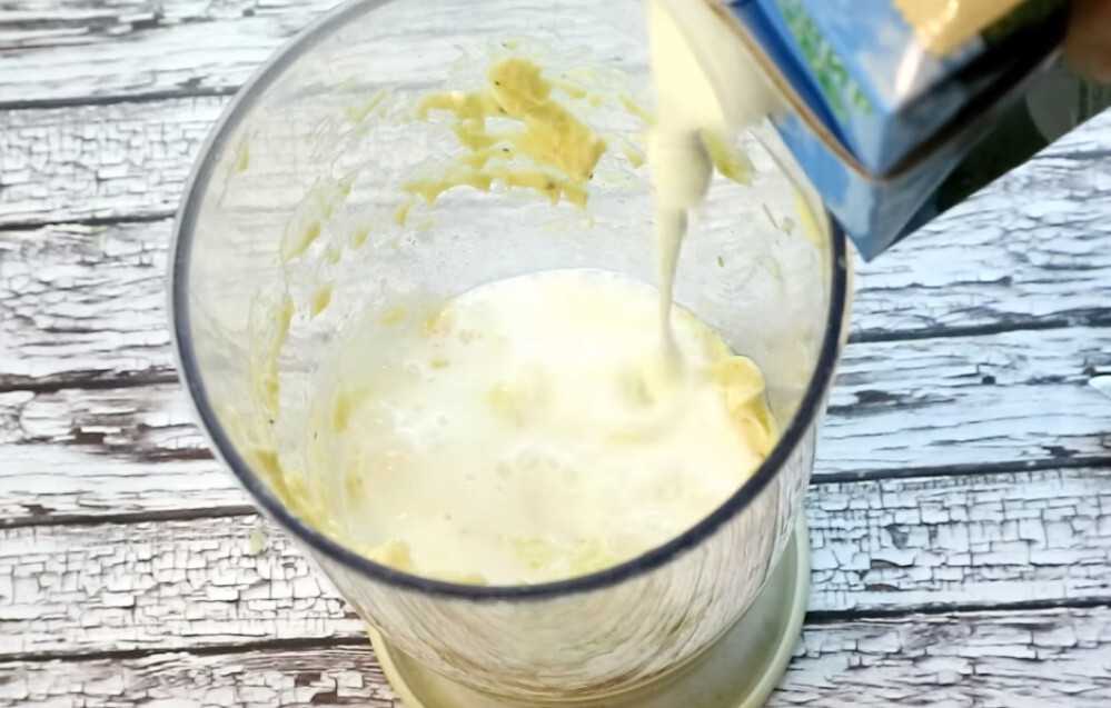 Взбиваем на самых маленьких оборотах. Постепенно поднимаем и опускаем блендер, чтобы все компоненты перемешались и превратились в однородное состояние.