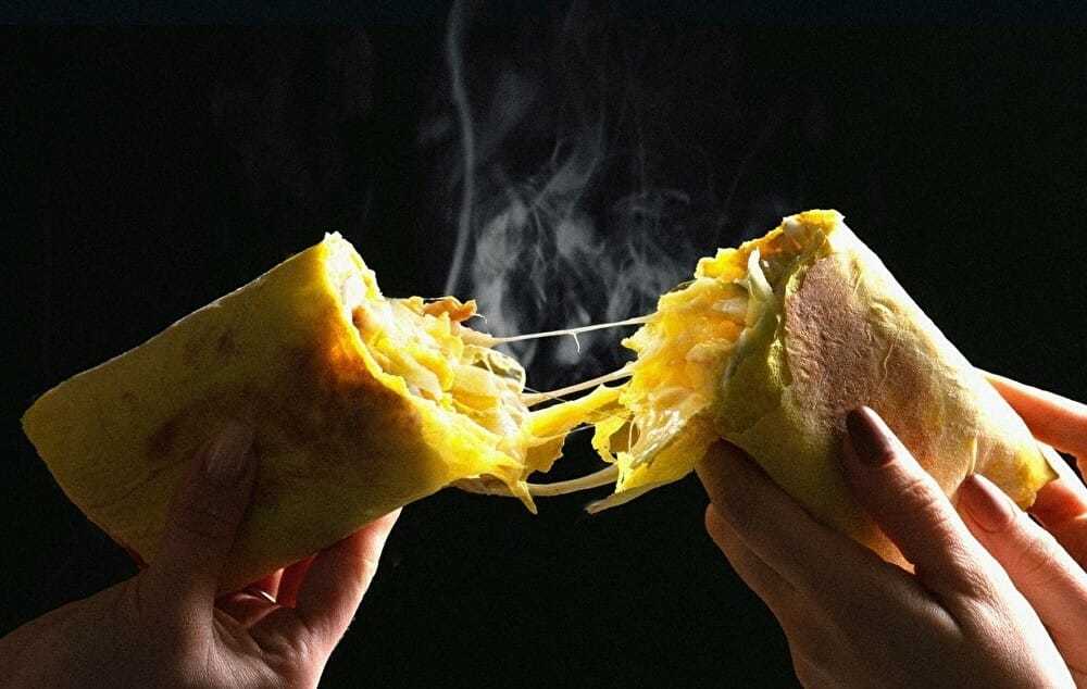 - Аккуратно заворачиваем все продукты в лаваш и обжариваем со всех сторон на сковородке, на медленном огне. Нужно просто каждую сторону подержать по 20-25 секунд на раскаленной сковородке. Не больше!