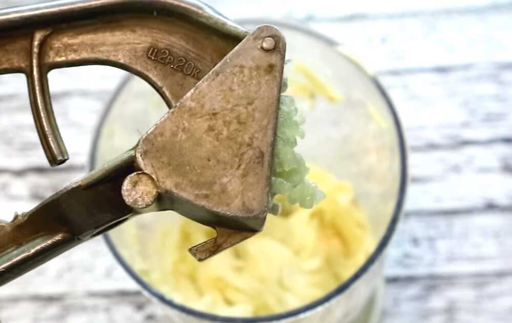 - Пропускаем через пресс чеснок и добавляем к огурцам.
