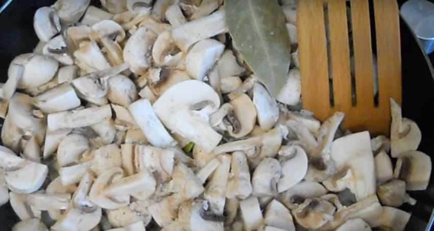 2. Лук мелко нарежьте и отправьте в разогретую сковородку с маслом. Когда лук начнет золотиться, добавьте грибы. Перемешайте, посолите, поперчите и выставьте средний огонь. На этом же этапе положите в сковороду лавровый лист. Накройте крышкой и, периодически помешивая, обжаривайте лук с грибами 7-10 минут.