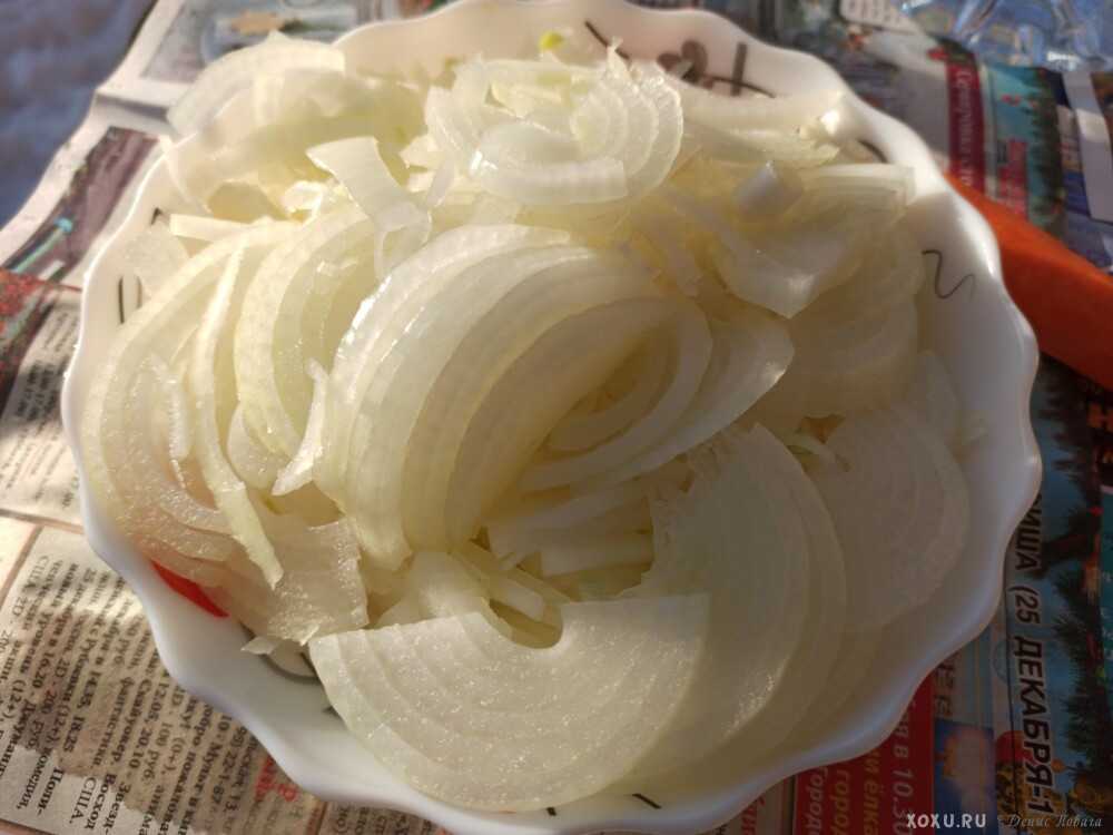 Огонь на максимум. Ждем закипания воды, и будем снимать пенку. Фото этого этапа упустил. Но, вы пожалуйста — успейте снять пенку, буквально через 20 минут она появится. Снимаем аккуратно навар с поверхности, и убавляем огонь, чтобы мясо бурлило, и отправляем лук. Получилась чаша лука.