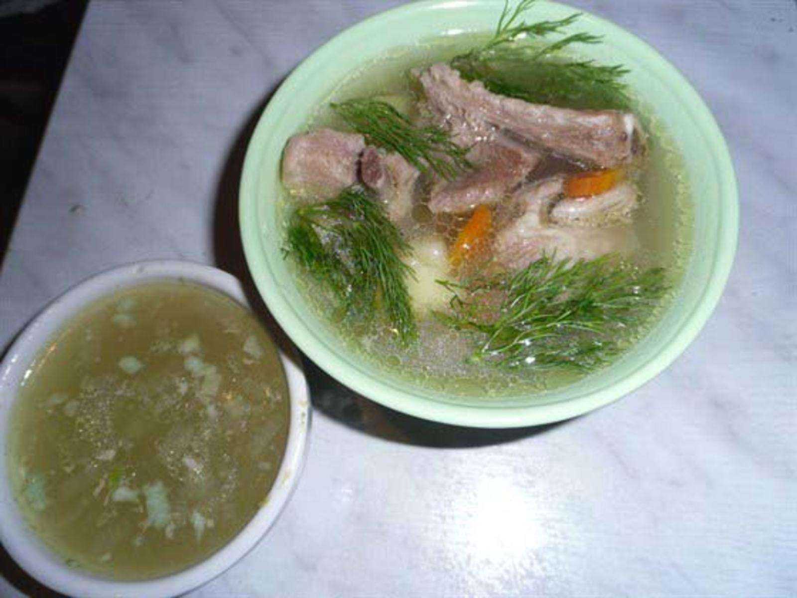 - Через 1,5 часа проверяем мясо – если баранина распадается на кусочки, то достаем из бульона все ингредиенты, кроме мяса.
