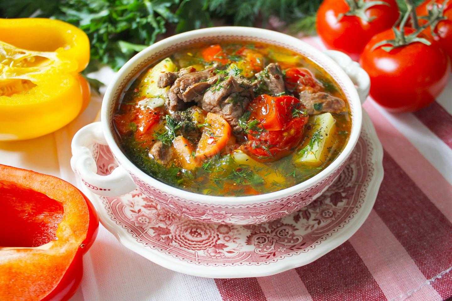 Сладкий перец нарезать крупными кусками, удалив серединку с семенами. Добавить в бульон с мясом и овощами. Продолжить варить около десяти минут, пока овощи не станут мягкими.