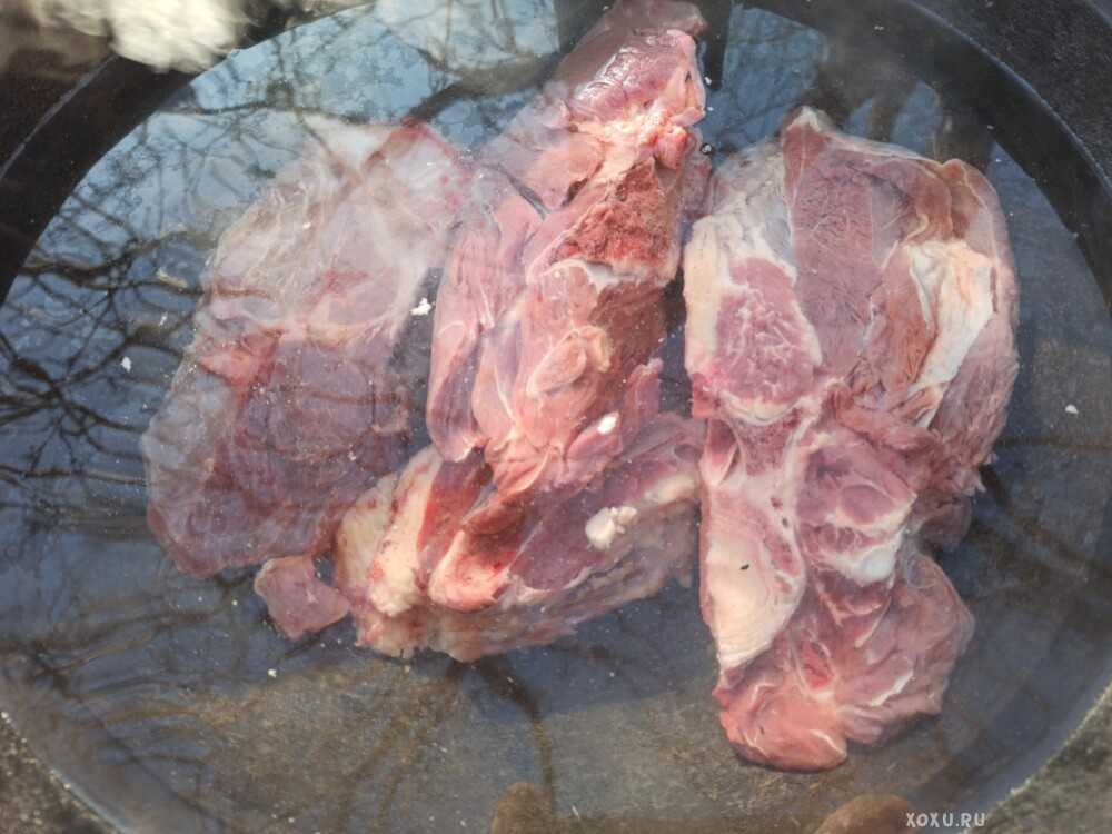 Шаг 2. Наливаю холодную воду в казан, отправляю 2 кг. мяса говядины на косточке (грудинка), и разжигаю костер в печи…