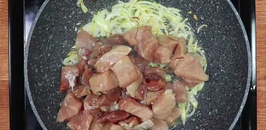 Когда из заражки выпариться вся жидкость и свинина приобретет небольшой румянец, пора закладывать лук.