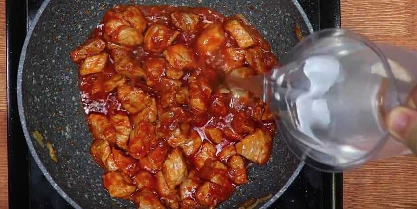 - Чтобы получилась свинина в томатном соусе, рецепт требует добавления томатной пасты. Добавьте указанное количество, еще стакан воды (можно 1,5ст.), перемешайте.