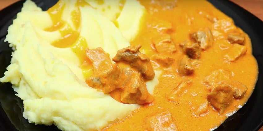 Если вам не слишком нравится томатный соус в качестве подливы, добавьте в него сметану. Вкус заливки сразу изменится – он станет мягче. Гуляш в таком соусе получается нежнейшим!
