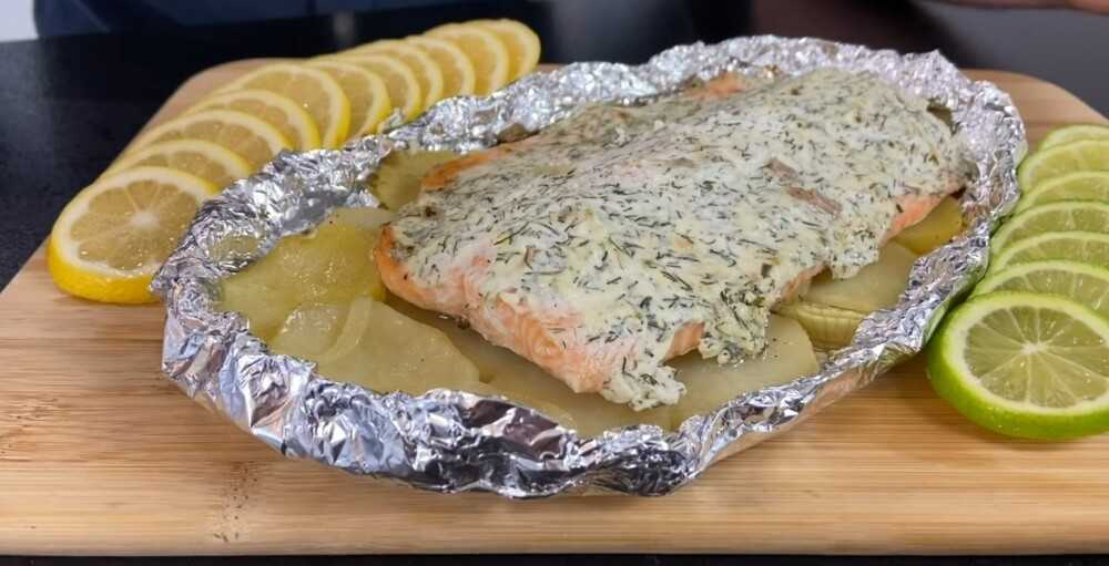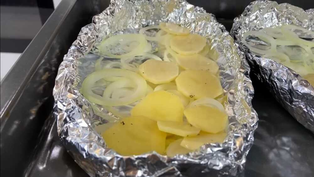 Накрыть вторым листом фольги, завернуть края и запекать полчаса.