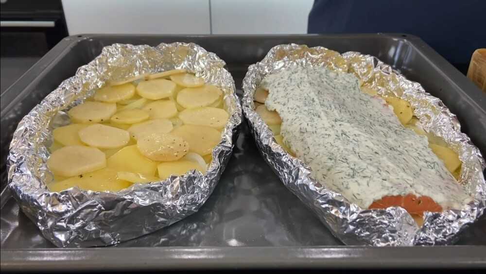 Фольгу чуть смазать маслом, застелить глубокую форму. Выложить на неё минтая или то, что вы взяли, так, чтобы куски не касались друг друга.