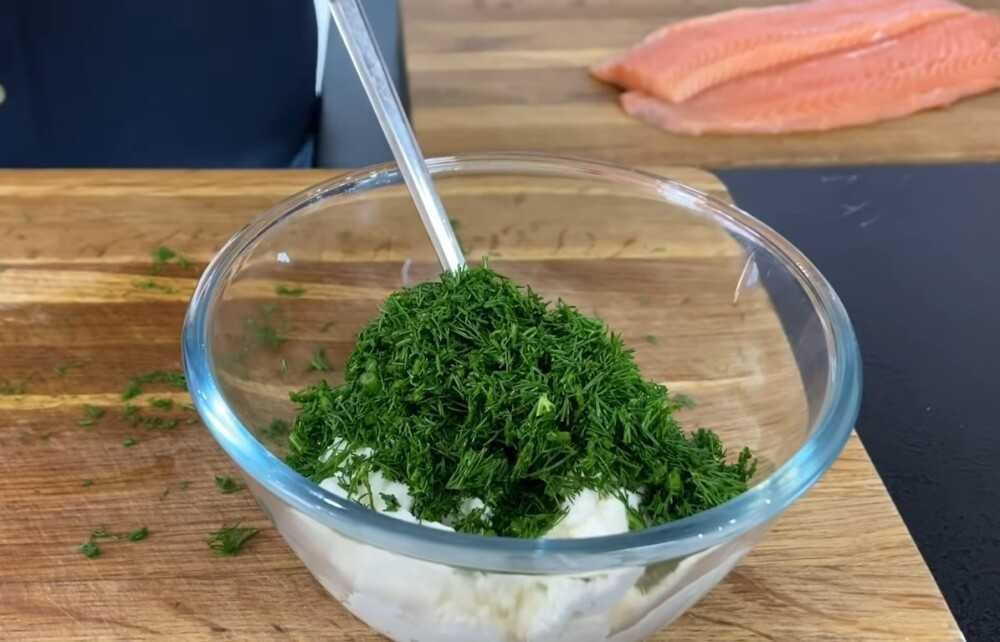 Далее мелко рубим 3 веточки свежего укропа и отправляем в соус. Снова все перемешиваем и оставляем немного настояться, пока маринуется рыба.
