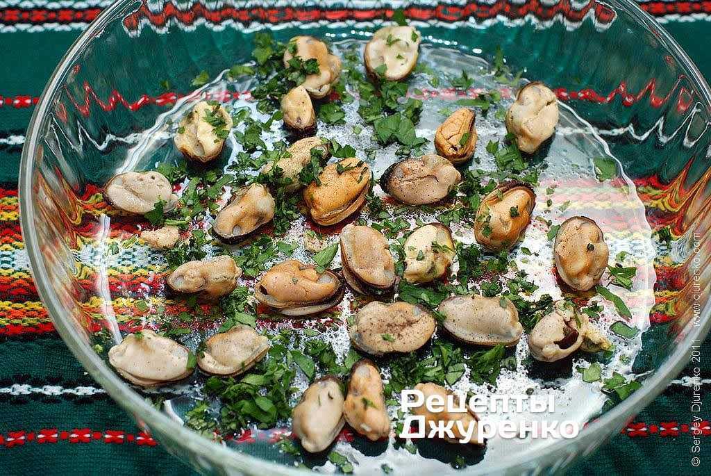 Мидии нужно разморозить, отварить и обсушить салфетками.