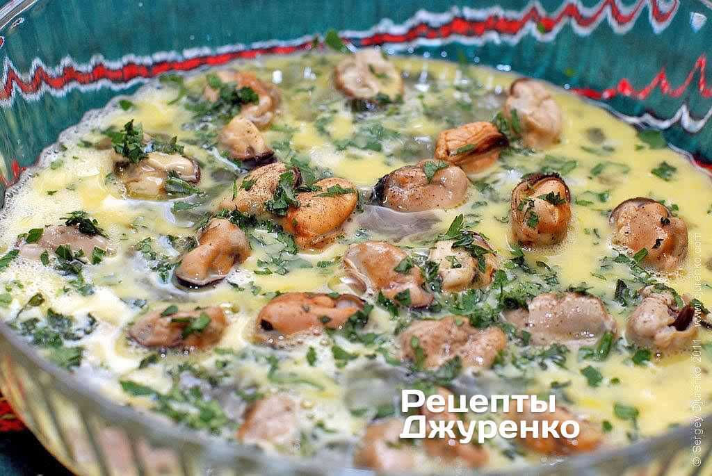Далее нужно сформировать блюдо для запекания. Форму следует застелить пищевой фольгой, смазанной сливочным маслом. Уложить слой отварных моллюсков, и налить слой сливочного соуса. В завершение посыпать тёртым твёрдым сыром.