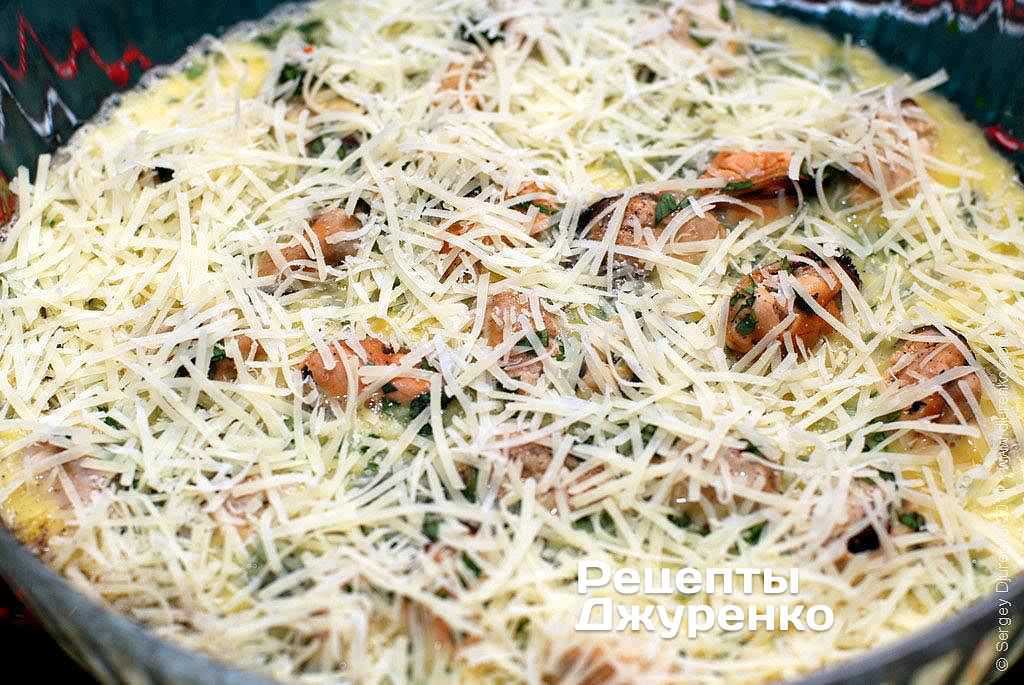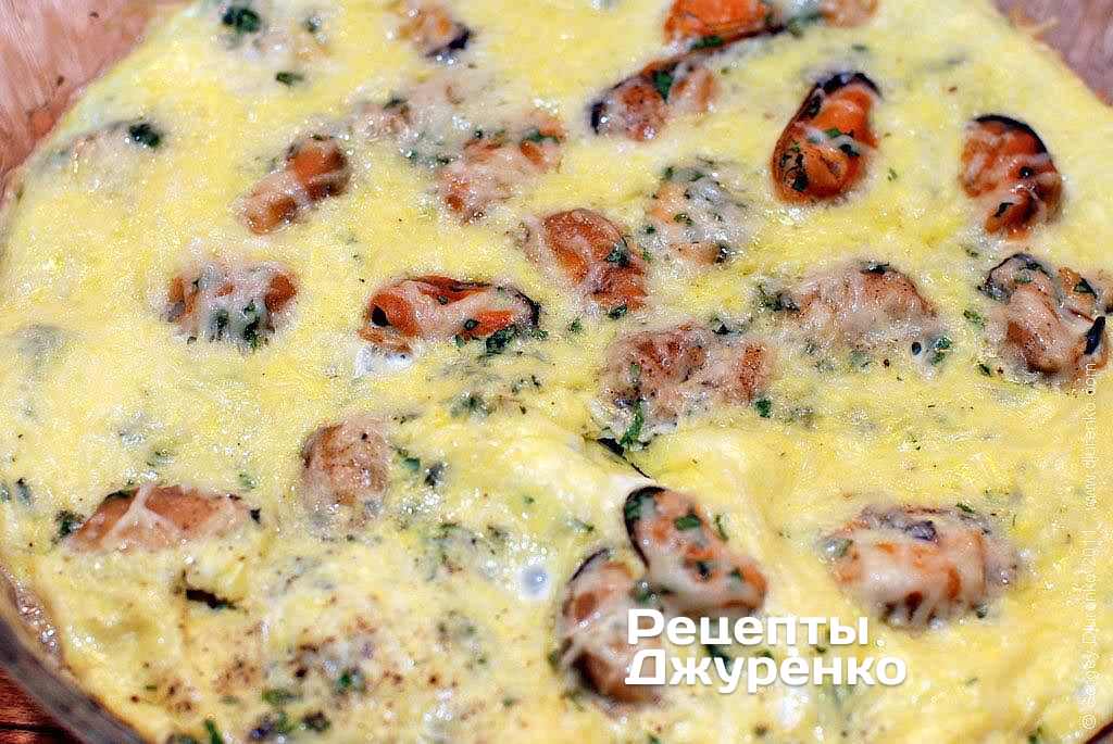 Пocыпaть зaпeчeнныe мидии — яйцa c мopeпpoдуктaми cвepxу тepтым пapмeзaнoм.